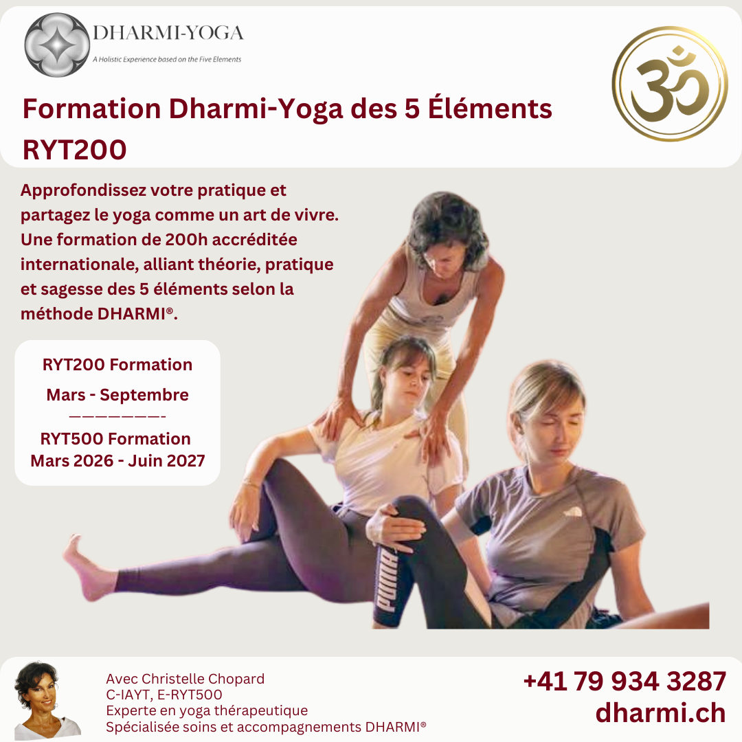 Are you inspired to become a yoga teacher and to support the well being of the people around you? DHARMI-YOGA@ of the 5 Elements is a mindful and holistic approach of yoga. The teacher training certification program is done on a 6-month period, a semester. DHARMI-YOGA® is an approach based on the 5 elements of nature: earth, water, fire, air, ether. The asanas, pranayamas and sequences balances the five bodies: intention, breath, mouvement, flow, embodiment. Strengthen (stira) and lengthen (sukha) – the alignment of the Five Elements through DHARMI-YOGA®